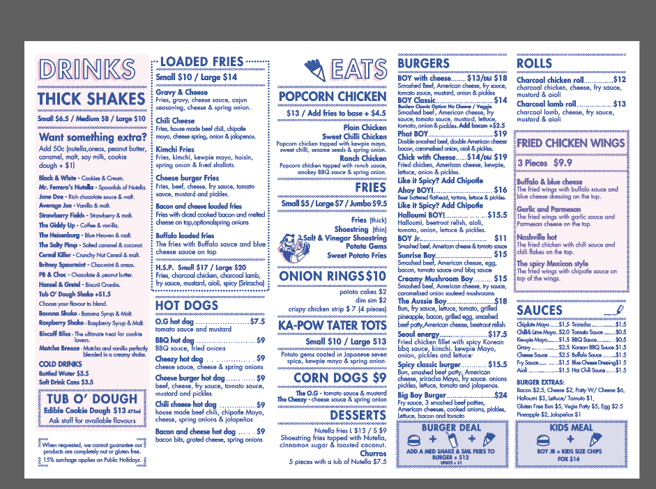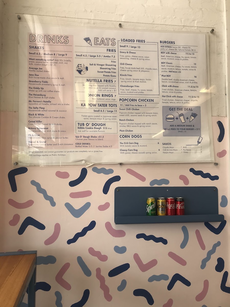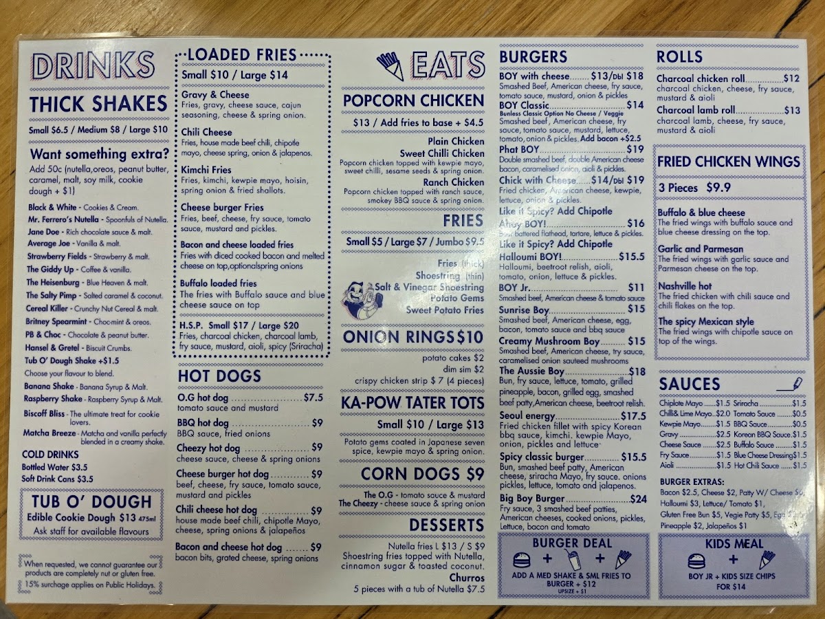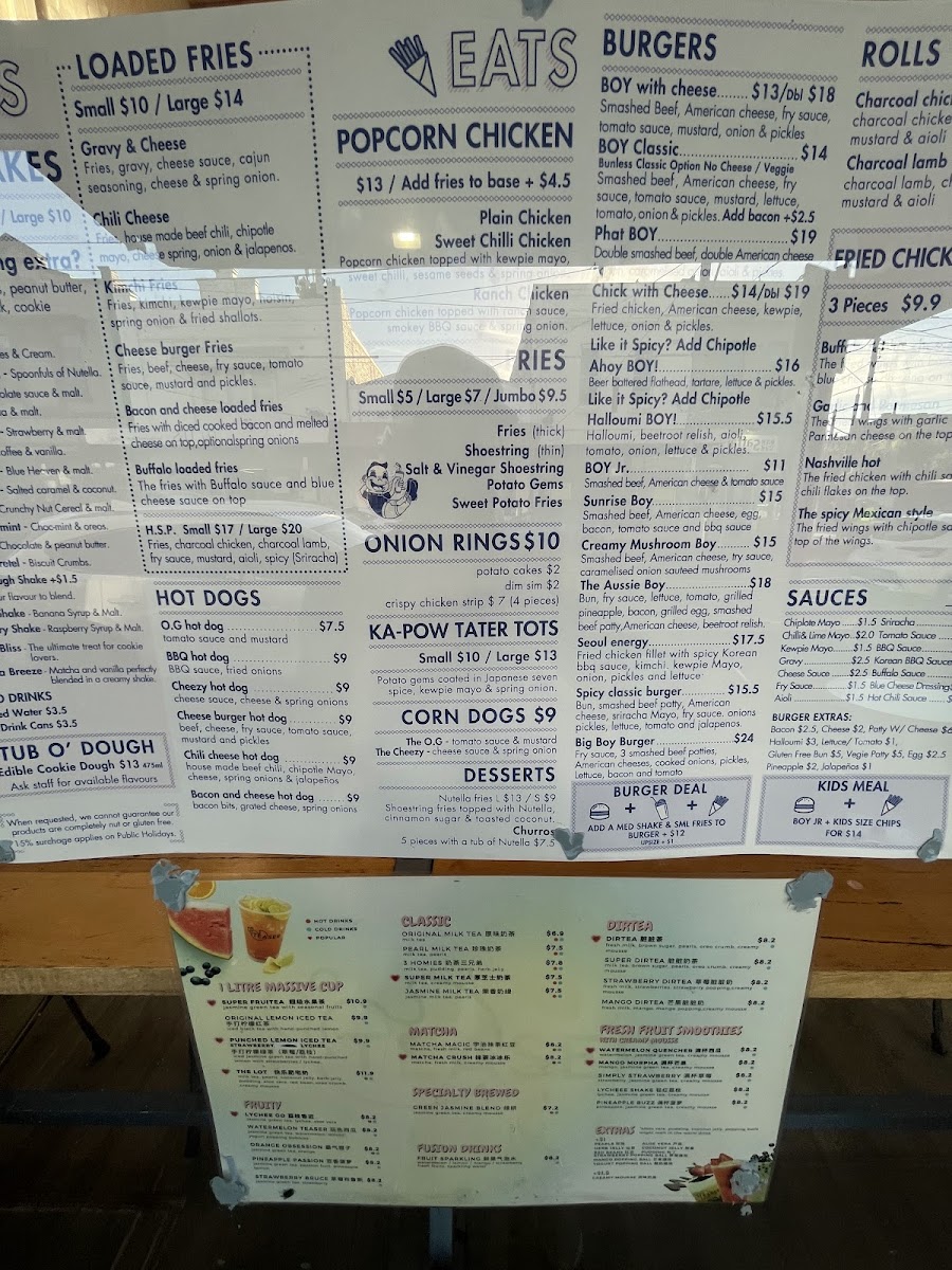 From a reviewer’s perspective, the menu at Boy & Co. offers a fun, indulgent selection that leans heavily into comfort food and snack-style bites, with highlights across categories like THICK SHAKES, LOADED FRIES, HOT DOGS, and BURGERS. Standout items include creative shakes like Black & White and Mr. Ferrero's Nutella, while the savory side shines with options such as Kimchi Fries, Bacon and cheese loaded fries, and the Chili cheese hot dog. The POPCORN CHICKEN range, including Sweet Chilli Chicken and Ranch Chicken, adds variety, and classic sides like Onion Rings, Potato Cakes, and Sweet Potato Fries round out the menu well. For something more filling, burgers like BOY Classic, Phat BOY, and Chick with Cheese are solid choices, while desserts such as Nutella Fries and Churros provide a sweet finish. Overall, the menu is playful, satisfying, and clearly designed for those craving bold flavors and hearty comfort food.